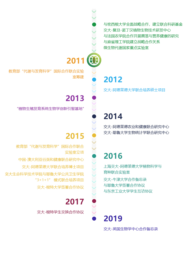 教育部代谢与发育科学国际合作联合实验室成立于2011年。实验室秉承“国际一流、中外协同、创新引领、科教融合”的发展理念,依托上海交通大学生物化学与分子生物学、微生物学、发育生物学等特色优势学科,联合多所世界一流高校和机构,强化机制体制、团队融合与资源共享的创新体系,围绕代谢的遗传和生化基础、代谢与发育互作、代谢发育与生物制造三个研究方向,开展代谢与发育交叉科学的基础理论创新性研究,引领代谢与发育学科发展,为保障粮食作物产量和品质、食品安全、生物药物创新、代谢性疾病的营养干预等提供新理论、新技术和新材料。构筑代谢与发育科学国际化科研平台和人才培养高地,培养具有国际视野的高层次人才。最终建成一个特色鲜明、管理模式先进、知名度高、硬件精良的代谢与发育科学研究的国际性学术机构。