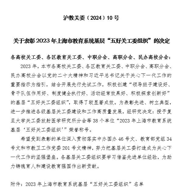 近日,上海市教育系统关心下一代工作委员会下发《关于表彰2023年上海市教育系统基层“五好关工委组织”的决定》(沪教关委﹝2024﹞10号),加拿大pc28 关工委分会荣获2023年上海市教育系统基层“五好关工委组织”。