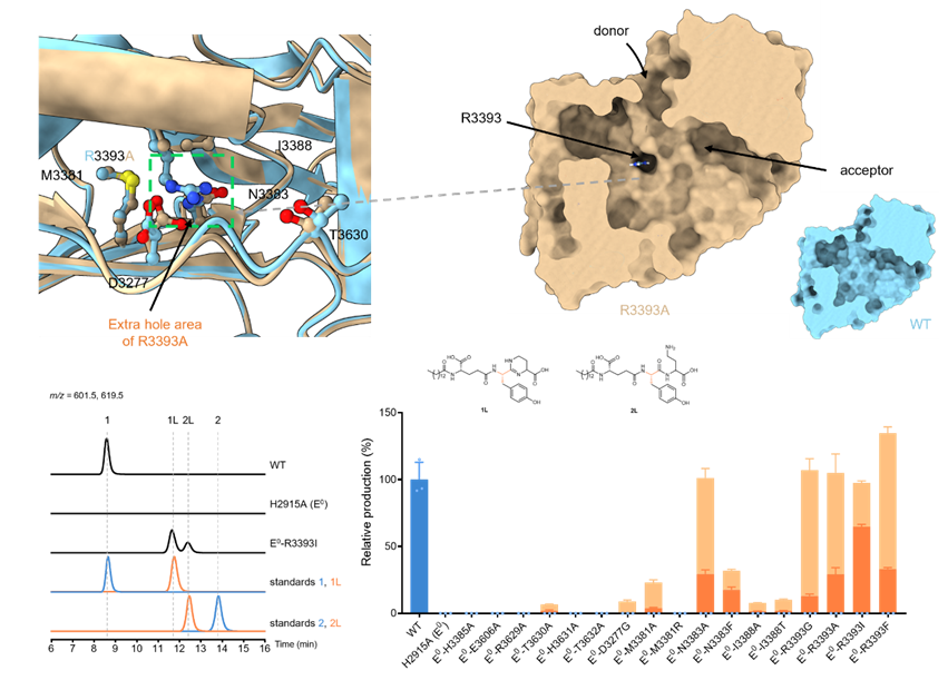 在立体化学控制方面,研究团队锁定了关键残基R3393及其周围残基构成的狭窄通道如同一个严苛的“手性检查点”,特异性识别并仅允许D型底物进入。通过对该位点的突变,研究团队成功打破了固有手性限制,使酶能够高效接受L型底物。这为未来工程化合成含非经典立体化学的多肽产物提供了直接的结构蓝图。