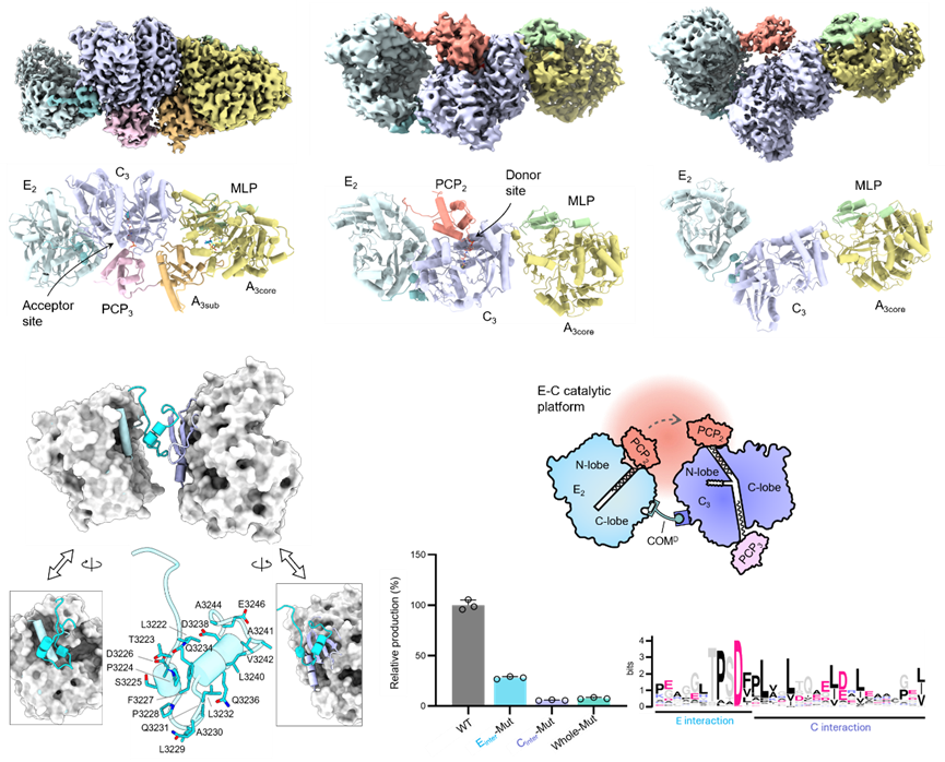 利用高分辨冷冻电镜技术,研究团队捕获了PvdL跨模块巨型复合物在不同催化状态下的多种构象。由COM结构域支撑起一个稳固的E-C催化平台,对于维持产量至关重要。通过三维变异分析(3DVA),观测到E2结构域相对于C3结构域存在约20°的振荡运动,并揭示了C3结构域“开-闭”构象切换与底物PCP结合的协同逻辑。